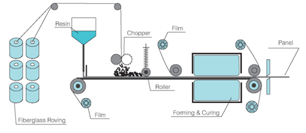 Resin min is applied to a base film moving at constant speed and flattened to ensure uninform thickness,chopped fiber in soecified length is distributed evenly onto the resin matrix(or fiberglass mat impregnated with resin min), covered with a top film and moved into the curing oven.