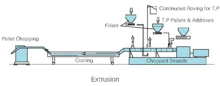 Thermoplastic rasin,additives and fiberglass reinforcements(roving or chopped strands)are mixed,compounded by screws and extruded into pellets,which is further processed to designed parts by injection molding.